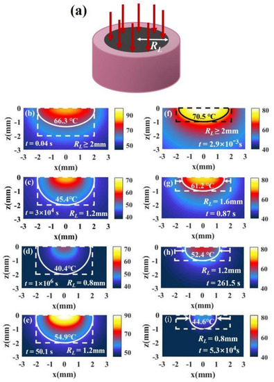 (a) Schematic of irradiation of a single spot light with a smaller radius than tissue radius (). (b–d) The temperature distributions of a tumor and the surroundings irradiated with I = 15 W/cm2 and under different irradiation radii for = 1 ( ). (e) The temperature distribution in case of RL = 1.2 mm and I = 30 W/cm2. (f–i) The temperature distributions with I = 15 W/cm2 and under different irradiation radii in the case of = 0.5 (, ). The volume fraction is 5.6 × 10−6 (fv = 5.6 × 10−6).