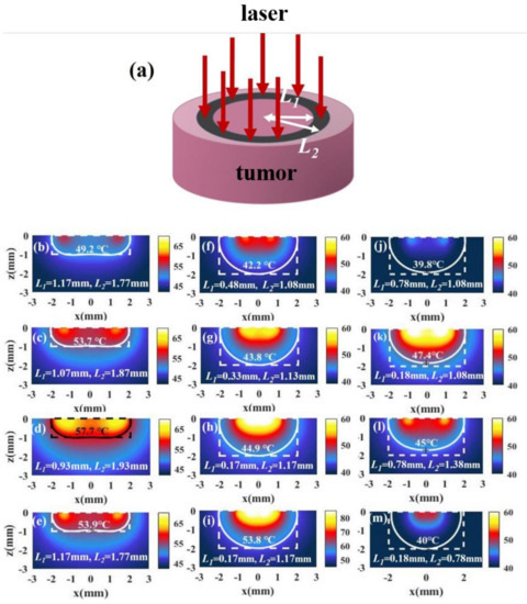 For tumors with a small aspect ratio, we find that the temperature distributions under irradiation with full-coverage light and irradiation with spot light with a smaller radius are not good because the temperature at the side (point B) is lower than that at the bottom (point C), as shown in Figure 5f–i. To reduce the temperature difference between points B and C, the light should be close to the edge properly. When we use ring light to irradiate the tumor, we can make the light close to the edge of the tissue by adjusting the position of the ring light. Figure 6a shows the laser irradiation strategy of ring light. We find that better temperature distributions can be obtained by using ring light for a tumor with a small aspect ratio, as shown in Figure 6b–d. This method is also effective for a tumor with a large aspect ratio, as shown in Figure 6f–h. However, the temperature of the tissue under irradiation with ring light is small; we can increase the temperature without affecting the temperature distributions by increasing the light intensity, as shown in Figure 6e,i. When we change the width of the ring light to obtain the optimal temperature distribution, we find that the regulation of ring light is difficult, because the temperature distribution is sensitive to the inner and outer radius of the ring light. The temperature distributions vary greatly when the changes in L1 and L2 are small, as shown in Figure 6j–m.