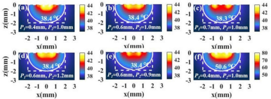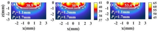 (a,b) The temperature distributions of a tumor and the surroundings with I = 15 × 104 W/cm2 and different positions of the inner spot P1 and the outer spot P2 in the case of tumor aspect ratio = 0.5 (, ). (c) The temperature distribution in the case of P1 = 1.1 mm and P2 = 1.7 mm with I = 90 W/cm2.