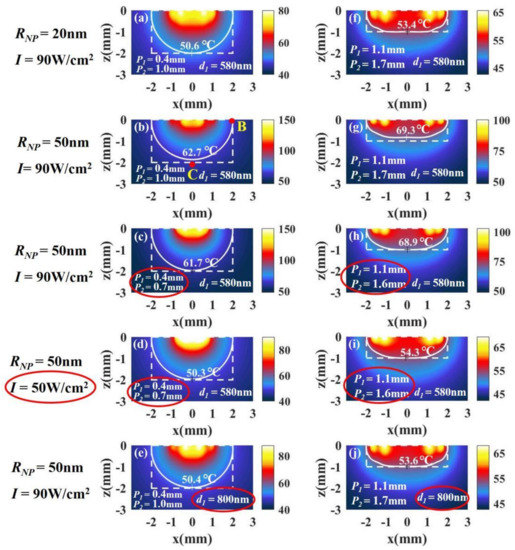 The temperature distributions of a tumor with (a–e) a large aspect ratio, = 1 (, ), and (h–j) a small aspect ratio, = 0.5 (, ). The radius of the nanoparticles is 20 nm in (a) and 50 nm in (b), and the other parameters used in the calculations in (a) and (b) are the same. To improve the temperature distribution in (b), we can change and in (c). We can reduce the temperature by reducing the light intensity in (d). We can also improve the temperature distribution by changing the distance between the particles in (e). Similar results can be obtained in the case of small aspect ratios in (f–j).