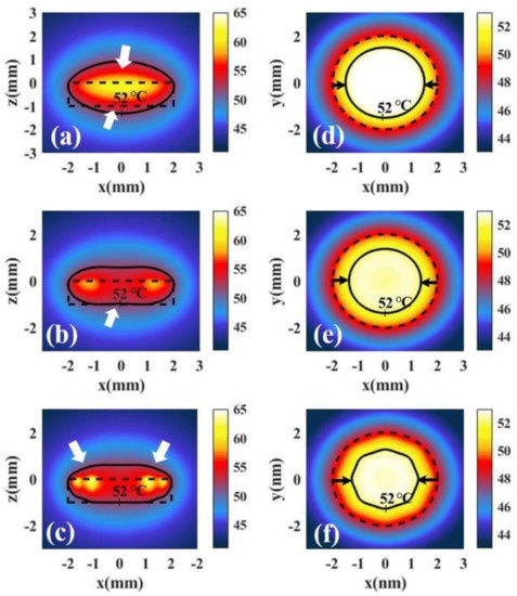 Figure 11a shows the temperature distribution along the x–z plane (y = 0) under irradiation with full-coverage light. We define healthy tissue over 52 °C as overheating. We find the overheating of healthy tissue at the top and bottom of tumor. Figure 11b shows the temperature distribution under irradiation with ring light. We find that the overheating of healthy tissue at the bottom of tumor can be avoided and the overheating of the top of the tumor can be reduced under irradiation with ring light. Figure 11c shows the temperature distribution under irradiation with spot array light. We find that the overheating at the bottom of the tumor can be avoided, but overheating at the top still exists. To compare the overheating at top of tumor, we calculated the temperature distribution at the x–y, z = 0.5 mm plane under irradiation with three shapes, as shown in Figure 10d–f. We find that the overheating at the top of the tumor under irradiation with ring light is much smaller than that under irradiation with full-coverage light. In addition, we also find that the overheating of healthy tissue at the top of the tumor can be further reduced under irradiation with spot array light. This is because the spot array light makes the light region more dispersed on the top of the tumor.