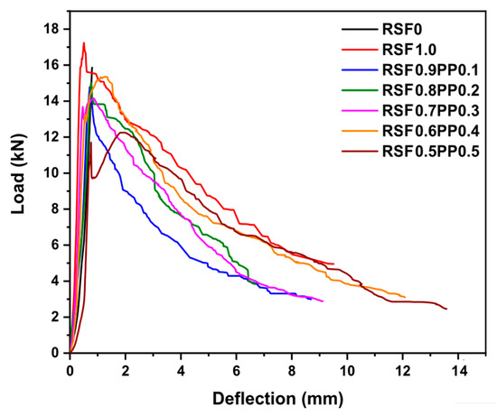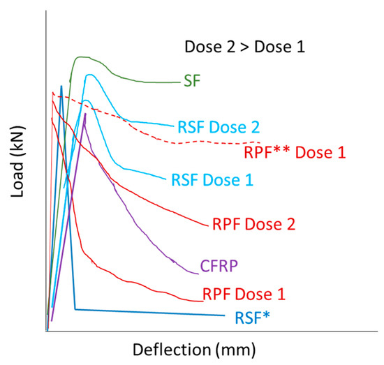 The kind, origin and dose of fibers affects the stress–strain characteristics. Figure 2 shows a general load–deflection scheme based on the bending test load–deflection curves obtained by different authors for FRC [98,99,100,101]. Load is proportional to deflection for low deflection values, indicating elastic behavior. After reaching a maximum load (load capacity) the material can failure or absorb some energy keeping part of the strength after the first crack. In the case of industrial steel fibers (SF) and RSF the material bears some of the maximum loads as shown by a constant load value with increasing deflection, which shows some plastic behavior. In general, a high percentage in fiber volume leads to an increase of the load capacity up to a maximum value, but it does not affect elastic modulus. In case of RSF, the residual load after cracking also increases with reinforcing fibers dose above all to an increase of the residual strength and toughness. In fact, similar behavior was observed for R-FRC reinforced with a similar dose of RSF (from tires) and industrial steel fibers [102], confirming the predominant effect of volume fraction compared to nature of fiber in that case. However, a different stress–strain behavior was obtained when RSF came from machining process discards [98]. These RSF increased brittleness and stiffness of the FRC, causing a detrimental effect on mechanical properties. This is mainly due to the mechanical weakening of steel fibers during the machining process and their pulling out during bending test [98].