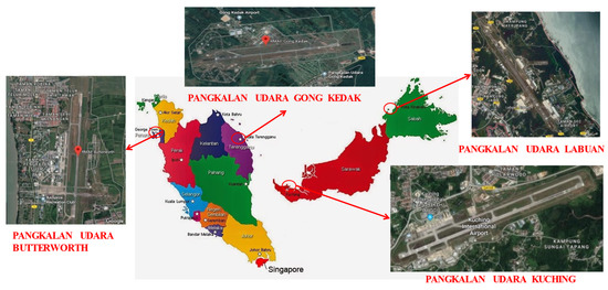 The RMAF has 13 bases in the country, which house the various administrative headquarters, flying squadron, training centers, and Research and Development (R&D) Centers. The bases in peninsular Malaysia are under the No. 1 Air Region’s command, while the bases in Sabah, Sarawak, and Labuan come under the No. 2 Air Region’s command. Malaysia being a country that is mainly surrounded by sea, it is undeniable that most of the bases are located close to the seashore area. These areas are emitting a high concentration of salt, which is a contributor to corrosion. Furthermore, the operating temperature of the areas located close to the seashore is around 30–32 °C. The bases that are located close to the shore line are depicted in
