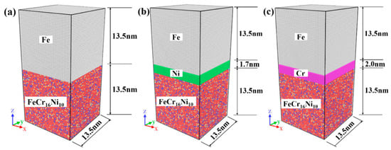 Molecular dynamics simulation was used to study the effect of the intrinsic interlayer on the diffusion bonding of the austenitic steel and ferric steel. The atomic interactions are formulated using the empirical embedded atom method (EAM) potential [58,59]. The initial model of FeCr16Ni10/Fe composite is shown in Figure 1a. The models of both Fe metal and FeCr16Ni10 alloy are put together inside a simulation box whose dimension is 13.5(X) × 13.5(Y) × 27(Z) nm3. The contact surface between Fe metal and FeCr16Ni10 alloy is the plane (0 0 1). There are 355,023 atoms in the model of the FeCr16Ni10/Fe composite, 172,773 atoms in the areas of Fe metal and 182,250 atoms in the areas of FeCr16Ni10 alloy. The initial model of Fe/Ni/FeCr16Ni10 composite is shown in Figure 1b. The Ni interlayer is put inside a simulation box whose dimension is 13.5(X) × 13.5(Y) × 1.7(Z) nm3, which contains 25,920 atoms. The initial model of Fe/Cr/FeCr16Ni10 is shown in Figure 1c. The Cr interlayer which contains 28,350 atoms is put inside a simulation box whose dimensions are 13.5(X) × 13.5(Y) × 13.5(Z) nm3. All molecular dynamics simulations are carried out by the Large-scale Atomic/Molecular Massively Parallel Simulator (LAMMPS) [60] and post-processing the atomistic data obtained from MD simulation is performed by the Open Visualization Tool (OVITO) [61].