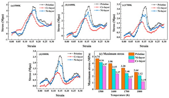To investigate the effect of the intrinsic interlayer on the hot rolling process, the FeCr16Ni10/Fe models with and without the Ni layer (Cr layer) were conducted to simulate the hot rolling process. The stress-strain curves obtained by simulating a hot rolling process of FeCr16Ni10/Fe composites with different intrinsic interlayers at the temperatures of 1500 K, 1600 K, 1700 K and 1800 K are illustrated in Figure 2. Since the coherent interface between the FeCr16Ni10 alloy and Fe metal will lead to the lattice mismatch [67,68,69], all stresses fluctuate around zero at the initial stage. Then the further plastic deformation will require a greater compressive stress. The stress-strain curves show a drastic rise as the strain reaches a certain value in the cases (i.e., pristine, Ni-layer and Cr-layer) at different temperature ranges. After the value of stress increases to the maximum, the stress drops rapidly. Then, the interface exhibits the progressive plastic deformation in which the flow stress gradually decreases with increasing strain. According to three-stage theory on the compounding process of the hot rolled sheet, the rough surface deforms under stress loading, which increases the contact area and then two metals in contact with each other produce a coordinated plastic deformation. The bonding difficulty of a bimetallic clad plate is measured by its maximum stress during the deformation process [70].