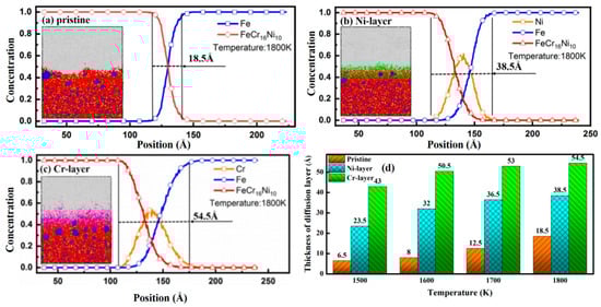 The thicknesses of the diffusion region of FeCr16Ni10/Fe composite with different intrinsic interlayers at the temperatures of 1500 K, 1600 K, 1700 K and 1800 K are illustrated in Figure 3d. The thickness of the diffusion region of FeCr16Ni10/Fe composite with pristine configuration is 6.5 Å at the temperature of 1500 K. The thicknesses of the diffusion region of FeCr16Ni10/Fe composite with the addition of the Ni-layer and Cr-layer increase by 261.5% and 561.5%, respectively. The thickness of the diffusion region of FeCr16Ni10/Fe composite with pristine configuration is 8 Å at a temperature of 1600 K. The thicknesses of the diffusion region of FeCr16Ni10/Fe composite with the addition of Ni-layer and Cr-layer increase by 300% and 531.3%, respectively. The thickness of the diffusion region of FeCr16Ni10/Fe composite with pristine configuration is 12.5 Å at the temperature of 1700 K. The thicknesses of the diffusion region of FeCr16Ni10/Fe composite with the addition of Ni-layer and Cr-layer increase by 192% and 324%, respectively. The thickness of the diffusion region of FeCr16Ni10/Fe composite with pristine configuration is 18.5 Å at the temperature of 1800 K. The thicknesses of the diffusion region of FeCr16Ni10/Fe composite with the addition of Ni-layer and Cr-layer increase by 108% and 195%, respectively. Obviously, the addition of the Ni or the Cr intrinsic interlayer induces a thicker diffusion region, which leads to enhancement of adhesion. For such enhancement, the Cr intrinsic interlayer has much better performance than the Ni intrinsic interlayer.
