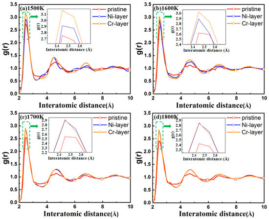 The RDFs of the interface of FeCr16Ni10/Fe composite with different intrinsic interlayers at various temperature have been examined, as shown in Figure 4. Similar to liquid, the RDF curves of the interfaces with no intrinsic interlayer all tend rapidly to be united after the second neighbor peak, which indicates short-range order and long-range disorder, from which we can conclude that an amorphous structure has appeared in the interface. This indicates a good agreement between the RDF curves and the previous visualization of atomic structure of the interfaces with no intrinsic interlayer (in Figure 3). However, the RDF curves of the interfaces with the addition of the Ni or the Cr intrinsic interlayer show sharper peaks, which indicates that a more crystalline structure appears. In short, all the above show that the interface structure changes from an amorphous state to a crystalline state when the intrinsic interlayer is present.