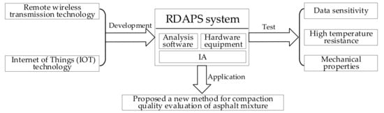 Based on remote wireless transmission technology, a high precision real-time data acquisition and processing system (RDAPS) for the motion state of aggregate was developed using high-strength and high-temperature-resistant materials, wireless transmission module, attitude sensor module, and micro power supply module. The system consisted of an intelligent aggregate (IA), analysis software, and hardware equipment. The wireless transmission performance of the IA with different baud rates (4800–115,200 bps), the disturbance characteristics of the IA with different vehicle models, the high-temperature resistance of the IA with different temperatures (25–200 °C), and the mechanical properties of the IA with different embedding conditions (without embedding and embedded in an asphalt mixture) were studied. A new method was proposed for the evaluation of the compaction quality of asphalt mixtures based on the IA. The overall research scheme is shown in Figure 2.