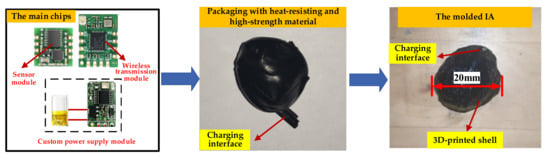 An intelligent aggregate (IA) with a particle size of 20 mm was prepared with an attitude sensor, micro power supply module, and wireless transmission module (transmitter). The IA is a design involving integration of the off-the-shelf electronic components that are commercially available. The IA was encapsulated using 3D printing technology (controlling the shape of the IA) and high-strength and high-temperature-resistant materials (ensuring the mechanical strength and signal stability of IA). The compressive strength of the finished IA can reach 80 MPa. The micro power supply module has the function of a remote switch, and the data acquisition interval can be controlled by software programming to ensure the long-term endurance of the IA. The IA can output its own data for three-axis acceleration and the three-axis attitude angle, and the preparation process is shown in Figure 3.
