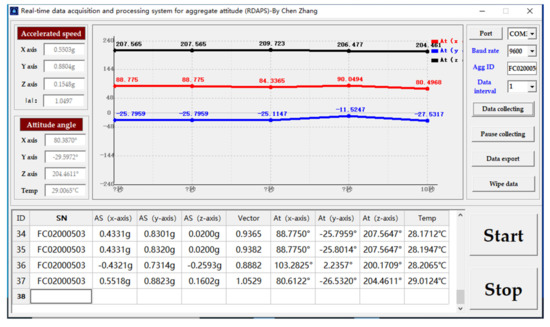 Using programming language, the motion data of aggregate can be collected wirelessly and analyzed in real time. The collected data can be saved as excel files in real time. The software interface is shown in Figure 4.