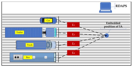 The laser rangefinder was used to determine the interference distance of various vehicles to the IA according to the IA motion data obtained by the RDAPS. When the vehicle reached a certain position, if the IA data fluctuations began to appear, the linear distance from the vehicle head to the IA was used as the interference distance Li (i = 1, 2, 3, 4). In the analysis process, 500 sets of data were collected for each vehicle type, and the final results were averaged. The data were investigated and analyzed according to the scheme in Figure 7, and the results are shown in Table 8.