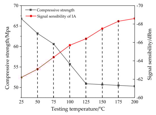 The mixing and molding temperature for asphalt mixtures is generally not more than 200 °C []. The IA was placed in the temperature box, and a high-temperature resistance test with different temperature conditions (25 °C, 50 °C, 75 °C, 100 °C, 125 °C, 150 °C, 175 °C, and 200 °C) was conducted. At the same time, the compressive strength and signal sensitivity of the IA at each temperature level were tested. In this process, eight parallel samples of IA were prepared. When an IA is heated to a certain target temperature, the IA is taken out for compressive strength testing and a new IA is put in for the next target temperature test, and so on. The results are shown in Figure 8.