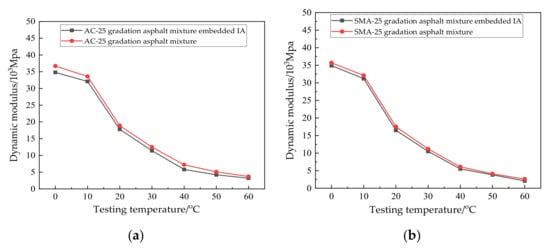From Table 9, it can be seen that the test values of each index for the IA were close to that of the limestone aggregate, which can indicate that the IA can replace a traditional aggregate to resist external forces and internal load transfer. According to Section 2.2 “Preparation of specimen”, the ordinary asphalt mixtures and asphalt mixtures embedded with IA were formed: an AC-25 gradation asphalt mixture, AC-25 gradation asphalt mixture embedded with IA, SMA-25 gradation asphalt mixture, and SMA-25 gradation asphalt mixture embedded with IA. Three parallel specimens were prepared for each asphalt mixture. The dynamic modulus tests of the four types of asphalt mixtures were conducted based on the UTM-30 hydraulic servo testing machine, and the results were averaged. The loading frequency was 10 HZ, and the test temperatures were 0 °C, 10 °C, 20 °C, 30 °C, 40 °C, and 50 °C. The results are shown in Figure 9.