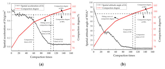 According to the kinematic principle, when the spatial attitude angle and spatial acceleration of IA maintained a stable value in a certain period of time during the compaction process, it can be inferred that the interlocking state between aggregates was better []. The relationship between the IA motion data and compaction times and the compaction degree of two asphalt mixtures is shown in Figure 10 and Figure 11.