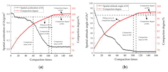 From Figure 10a, it can be seen that, with an increase in compaction times, the spatial acceleration of IA showed an unstable decreasing trend at the initial stage (less than 60 times), a stable decreasing trend at the middle stage (61–112 times), and a stable state at the late stage (113–160 times). This is because the early stage of compaction is the stage of the transition of the AC-25 asphalt mixture from a loose to a dense state, and the motion state of the IA in this stage is random []. However, with the gradual compaction of asphalt mixture, the active range of the IA is gradually reduced, and the spatial acceleration is in an overall downward trend in this stage. At the middle stage of compaction, the asphalt mixture is further compacted, and the interlocking state between aggregates is formed at this stage. At this time, the movement of the IA is limited, and the spatial acceleration decreases sharply. When the compaction degree reaches 98% of the specification requirements, the corresponding compaction time is 106, and the spatial acceleration of the IA is not in a stable state at this time. When the compaction was 113 times, the corresponding compaction degree was 99%, and the spatial acceleration of the IA was stable at about 0.05 g/cm3, due to the common drift phenomenon of the sensors at this time. It can be inferred that the interlocking state between the internal aggregates of the asphalt mixture was in a relatively optimal state.