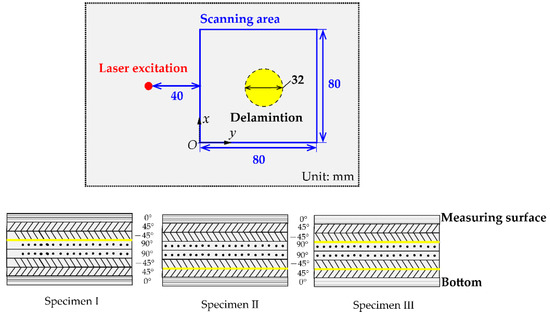 The specimens were the 1.5 mm crossply CFRP made of T300 prepreg materials with a stacking sequence of [0/±45/90] s, as shown in Figure 2. Since the material properties of CFRP are not known in advance, two specimens with single delamination defect at different layer positions were made to study the wavenumber characteristics related to the e material properties. Additionally, its purpose was also to analyze the wavenumber characteristics in the composite specimen with multiple delamination defects. Specimen I and specimen II were the composite plates with a single defect, and specimen III was the composite plate with multiple defects. From the perspective of the through-thickness panel layup, a single Teflon insert was added to specimen I between the fifth and sixth layer, and to specimen II between the second and third layer; two Teflon inserts were added in specimen III, one between second and third layer, the other between the fifth and sixth. The diameter of all delamination defects was 32 mm, and the distance between two Teflon center in specimen III was 10 mm. The TWM laser interferometer scans an area of 80 mm × 80 mm with a spatial resolution of 1 mm.