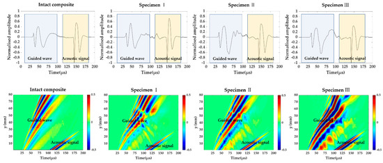 Figure 3 shows the signals measured at (40 mm, 55 mm) and time–space wavefield at x = 40 mm in the intact composite plate and three specimens. The total signal includes guided wave and acoustic signal. The acoustic wave here refers to the signal propagated through the air. The measurement time of the acoustic signal coincides with the time taken for the wave to travel a distance of a certain distance at a speed of 340 m/s in the air. In addition to the acoustical signal, the prominent component of guided wave is the A0 mode because it is the main component of the out-of-plane displacement. The guided wave velocities in the intact composite plate are different from one in three damaged composite plates. Additionally, the velocity of the guided wave becomes slower for specimen I, II and III, because the slope of the line is smaller compared to one in the intact composite.