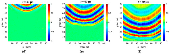 The wavefield snapshots (a–c) are at 40, 60 and 80 μs acquired by laser shot on circular aluminum foil. The wavefield snapshots (d–f) are at 40, 60 and 80 μs acquired by laser shot on rectangular aluminum foil.