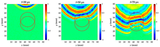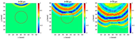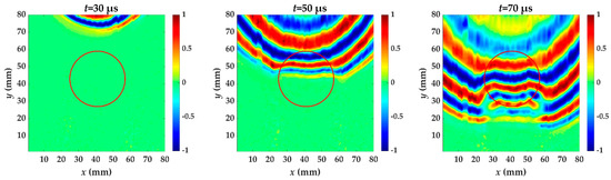 For specimen I, Teflon insert is between the fifth and sixth layer. Figure 6 shows the wavefield snapshots acquired from scanning area at different times. The red circle is the delamination made artificially in specimen I. In the out-of-plane displacement, the acquired wavefield shows a stronger A0 mode. A0 mode with higher amplitude has reached the delamination region at t = 50 μs, and the wavelength is reduced. This is because the delamination causes the incident waves to split and propagate independently through the upper and lower laminates [8], and the thickness of the measured side changes. Therefore, the wave in the delamination region propagates at a velocity lower than that in the undamaged region. Each moment subsequently is accompanied by wave pattern anomalies and a reduced wavelength.