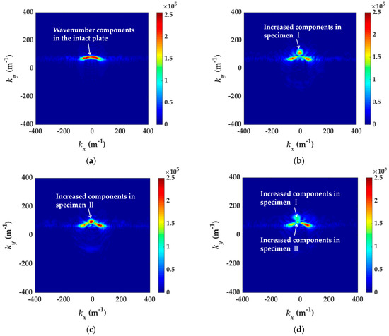 The kx-ky spectrums at 98 kHz. (a) The intact plate, (b) specimen I, (c) specimen II and (d) specimen III.