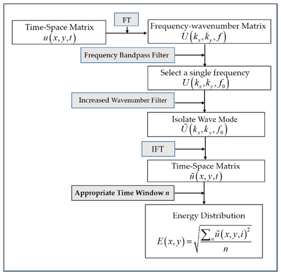 (3) An inverse Fourier transform is then applied, so that the wavefield with increased wavenumber components can be obtained by Equation (5). By observing the energy diagrams at different times, the appropriate time windows can be selected to highlight the energy anomalies and represents the selected moment. The energy anomalies can be called localized wave energy. The energy anomalies distribution can be calculated by Equation (6), and delamination defects can be identified by localized wave energy.