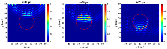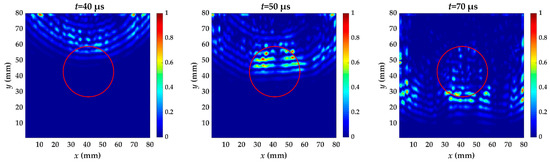 The energy distribution of specimen II caused by the increased wavenumber at t = 40, 50 and 70 μs. The red circle is the delamination made artificially in specimen II.
