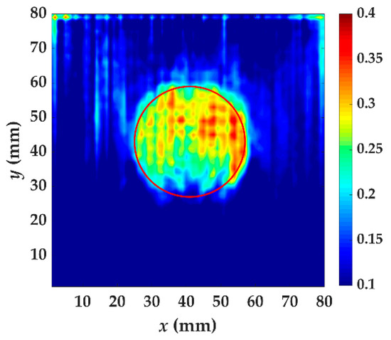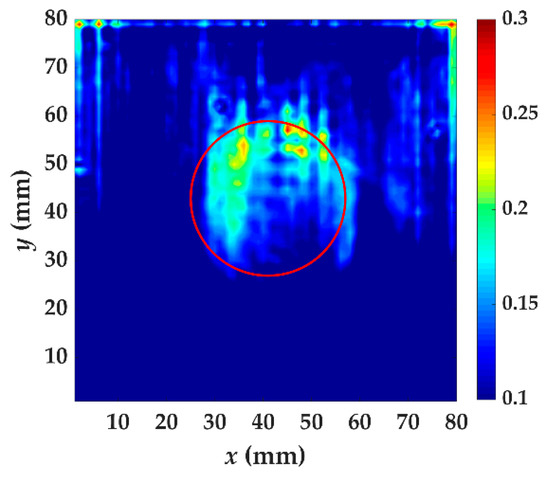The test result of specimen II using localized wave energy algorithm. The time windows are from t = 40 μs to t = 70 μs. The red circle is the delamination made artificially in specimen II.