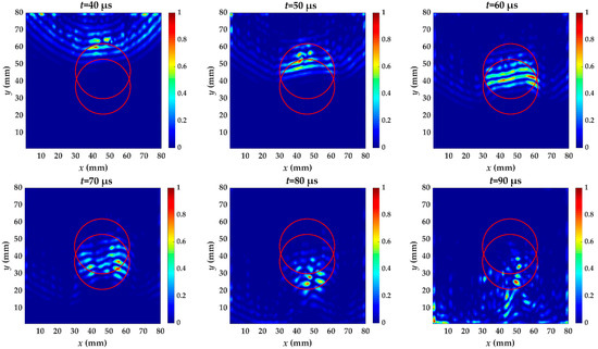 The energy distribution of specimen III caused by the increased wavenumber at t = 40~90 μs with 10 μs intervals. The red circles are the delamination made artificially in specimen III.