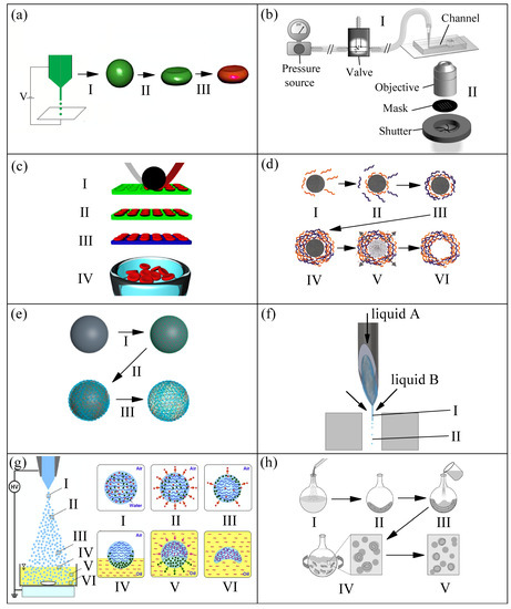 In several references [50,54,55], commercialized spherical quasi-rigid microparticles of polymethyl methacrylate (PMMA) of around 6 and 10 μm in diameter (Spheromers® CA, Microbeads AS) were used to try to mimic RBCs. However, as it can be expected, the rigidity of these particles makes them unsuitable for this purpose. Figure 1f liquid–liquid flow-focusing with a hypodermic needle [44,45,46,56,57]: (I) polydimethylsiloxane (PDMS) precursor, formed by a base of vinyl-terminated siloxane oligomers (Part A) and a curing agent of siloxane oligomers and catalyst (Part B), is injected through a hypodermic needle and a liquid microjet is steadily ejected thanks to the action of a coflowing viscous liquid stream, and (II) microjet breakup into droplets (which are later cured by heat). Since 2016 [44], the interest in the production of monodisperse particles of PDMS has grown significantly due to the remarkable properties of this polymer, among others: flexibility, biocompatibility, and permeability to gases. In Refs. [44,45,46], the authors used the following mixing ratios (Part A:Part B): 6:4, 8:2, and 10:1 to produce spherical particles of around 7 μm in diameter. Figure 1g electrospray with solvent diffusion [47]: (I) two types of solvents, 20 vol% of evaporable solvent (ethanol), and 30 vol% of diffusible solvent (dimethyl sulfoxide, DMSO) were added to the chitosan aqueous solution that was used as the liquid for electrospraying (spray liquid) to form charged chitosan droplets, (II) evaporation of the evaporable solvent (red stars) due to the high temperature of the droplet, (III) phase separation between the diffusible solvent (green circles) and chitosan polymers (blue curved lines), (IV) diffusion of diffusible solvent to the surface in contact with the oil collection solution (yellow fluid) due to the intersolubility, (V) diffusion of the diffusible solvent into the oil collection solution while the cross-linker (terephthalaldehyde, pink curved lines) diffuses into the droplet reacting with chitosan polymers, and (VI) particles with concave morphologies (around 7.4 μm in size) like RBCs obtained by the diffusion of the diffusible solvent and the complete reaction of chitosan with the cross-linker. As reported previously by the same authors, when the spray liquid did not contain evaporable solvent and diffusible solvent, spherical chitosan microspheres with sizes similar to RBCs were obtained [58].