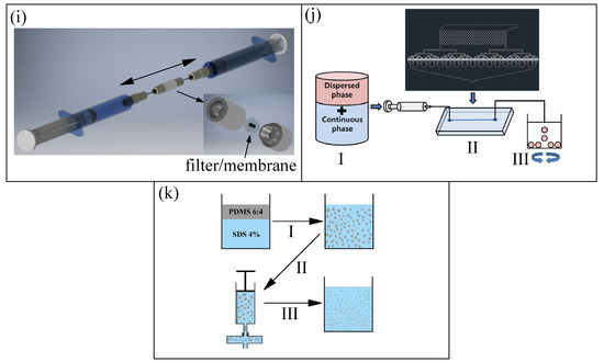Figure 1h lipid film hydration [48,49]: (I) addition of powered lipids (soybean lecithin) to an organic solvent (chloroform), (II) lipid cake resulting from freezing of the initial solution, (III) addition of the aqueous solution including water-soluble drugs, (IV) production of large multilamellar vesicles by hydration and agitation of the mixture, and (V) final small unilamellar vesicles after sonication and extrusion through polycarbonate membranes (pore size of 8 μm) to improve the monodispersity of the vesicles’ diameters. The giant unilamellar vesicles (GUVs) presented sizes around 6 μm. Figure 1i two-syringe membrane emulsification [50]: back-and-forth manual movements produced an emulsion of PDMS/ water (with SDS surfactant) phases, the droplets were thermally cured into spherical solid microparticles of around 9 μm, reaching a high production rate (1 g/h). The authors used several mixing ratios of PDMS (10:1, 15:1, and 30:1) to check the influence on the mechanical behaviour, also comparing the results with PMMA particles mentioned previously, and with commercialized spherical quasi-rigid microparticles of polystyrene (PS) of around 11 μm in diameter (Dynoseeds® TS 10, Microbeads AS AS). In the same way, as in the case of PMMA particles, the rigidity of PS particles makes them unsuitable to mimic the behaviour of RBCs. Figure 1j 512-channel geometric droplet-splitting microfluidic device combined with a post array part [51]: (I) premixing solutions, dispersed phase (PLGA dissolved in dimethyl carbonate, DMD, at 2 wt%) and continuous phase (polyvinyl alcohol, PVA, dissolved in deionized water at 2 wt%), (II) injection of premixed emulsion through the device, and (III) collection under stirring to remove solvent from the microspheres, satellites were filtered during the collection process by using a sieve. The droplets were polymerized/solidified by the evaporation of the solvent, resulting in spherical PLGA particles of around 9 μm in diameter. Figure 1k premix membrane emulsification [52]: (I) vortex premix emulsification of the continuous phase (water with sodium dodecyl sulfate (SDS) surfactant) and the dispersed phase (PDMS precursor, mixing ratio 6:4), (II) membrane emulsification of the previous mixture passing it through a membrane with a pore size of 10 μm (three times), and (III) thermal curing, obtaining spherical PDMS particles with diameters around 7 μm. This membrane emulsification method allowed for reaching a high production rate (1 g/h) of PDMS particles (6:4), compared to the liquid–liquid flow-focusing method (0.01 g/h) [44]. To finish, a membrane emulsification method similar to that shown in Figure 1k was used to produce micelles of Brij L4 surfactant in water. Briefly, after a manual premixing of the surfactant (typically 1 wt%) and pure water, the emulsion was forced to flow through a precolumn filter having a membrane with an average pore size of 20 μm, resulting in micelles with diameters around 7 μm [59], but with a high polydispersity that needs to be improved.