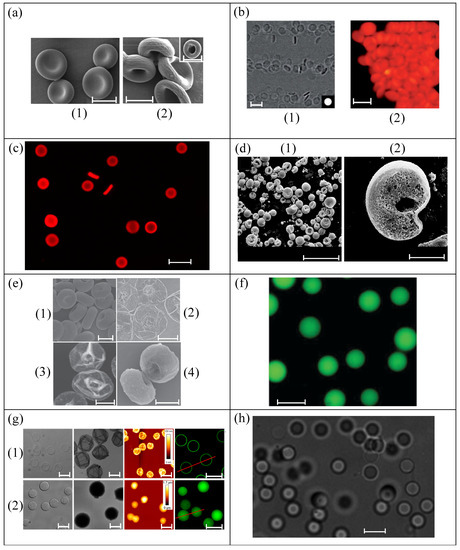 In spite of the biological functionalities of PDMS particles not being studied in Refs. [44,45,46,50,52], they were explored by other authors for spherical PDMS particles with sizes much smaller (around 1 μm) [73] and higher (around 80 μm) [72] than those of RBCs. PDMS microbeads have been demonstrated to have potential use as discrete oxygen sensors [72], see Figure 4c, and for the delivery of reporter genes into cultured animal cells [73]. Chitosan RBC templates [47] displayed acid-triggered dissolution and auto-fluorescence, which makes them very promising for biomedical applications, but these applications were not developed in this study.