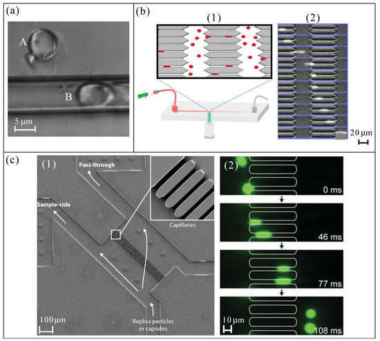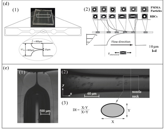 Deformation assessment of microparticles (RBC templates) from the literature: (a) PLGA RBC template flowing through a glass capillary (5 μm inner diameter) (A), and outside the capillary (B) [34]; (b) illustration of the silicone microfluidic device packed with constricted pores (1), and image sequence showing how a single HEA hydrogel particle passed through a constricted pore (31 ms of time lapse between the frames) (2) [38]; (c) SEM image of the PDMS microfluidic device with the possible flow paths (1), and time-lapse fluorescence microscopy images of PEG hydrogel particles passing through the constrictions [42,43]; (d) picture and illustration of the PDMS microfluidic device with a hyperbolic microchannel (1), and an example of deformation of PMMA particles and RBCs [54]; (e) the whole geometry of the glass axisymmetric micronozzle used (1), visualization of microparticles flowing through the glass micronozzle (the dotted line points out the nozzle neck) (2), and deformation index (DI) definition (3) [50]. Reproduced from Refs. [34,38,42,43,50,54] with permission from National Academy of Sciences, American Chemical Society, WILEY-VCH Verlag GmbH & Co. KGaA, MDPI, and Elsevier Science INC.