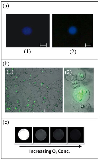 Illustration of biological functionalities of RBC templates. (a) chemiluminescence experiments showing the oxygen carrying capacity: (1) PLGA RBC template (2) mouse blood [34], the scale bar is 0.5 cm; (b) MDA-MB231 cells encapsulated in PEG microparticles: (1) at day 0 and (2) at day 13 [71], green fluorescence represents live cells, the scale bar is 50 μm; (c) phosphorescence intensity of a PtTFPP-bearing PDMS microbead (150 mm diameter) at various oxygen levels [72]. Reproduced from Refs. [34,71,72] with permission from National Academy of Sciences, and The Royal Society of Chemistry.