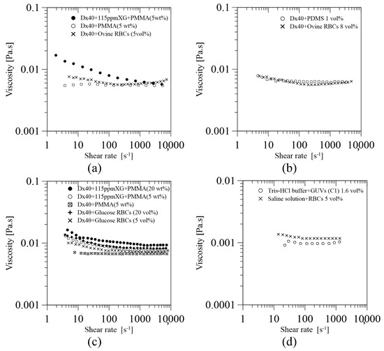 Pinho et al. [55] extended the work of Calejo et al. [54] by using an analogue fluid based on quasi-rigid microbeads made of PMMA suspended in a viscoelastic carrier fluid made of a solution of Dx40 and XG (115 ppm). Two concentrations of PMMA, 5 and 20 wt%, were studied. The experimental results, shown in Figure 5c, show that the shear-thinning behaviour of the viscosity curves improves by the addition of XG 115 ppm to the solution of Dx40 with 5 wt% of PMMA particles, as it was mentioned previously. Additionally, the viscosity curves for the viscoelastic solution with PMMA microparticles, 5 and 20 wt%, suspended in Dx40 and XG 115 ppm show a rheological behaviour close to that obtained for the glucose-rich RBCs, representing the pathological RBC, for 5 and 20 vol%, respectively.