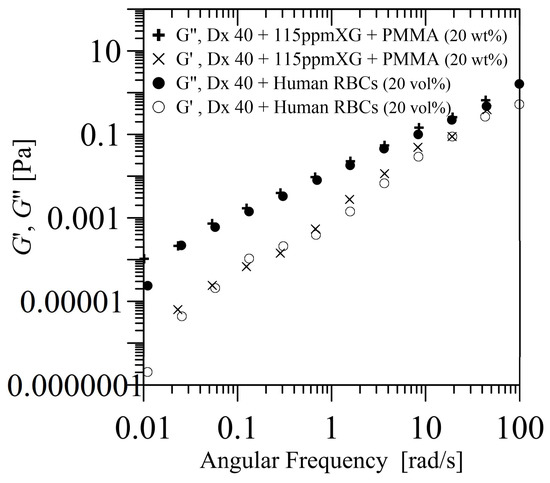 SAOS measurement of the storage () and loss () moduli for a solution of PMMA of 20 wt% suspended in Dx40 and 115 ppm XG, and a solution of healthy RBCs of 20 vol% suspended in Dx40 [55].