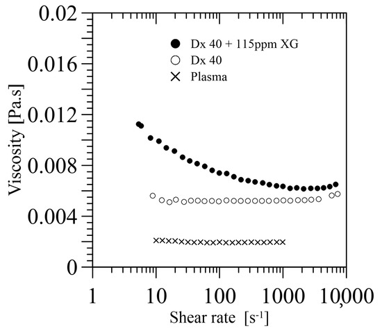 To end this section, it should be pointed out that the viscosity of the carrier fluid used until now, such as water, Dx40, or Dx40+115 ppm XG, etc., does not match that of real plasma at 20 or 37 C, around 1.9 and 1.3 mPa·s, respectively. Brust et al. [24] showed that human blood plasma under steady shear flow has a Newtonian behaviour with a very low shear viscosity of about 1.95 mPa·s at 20 C, which completely differs from the carrier fluid viscosity used in the literature, see Figure 8. Future blood particulate analogue fluids should take this issue into account because it could be a key point in multiphase phenomena, among others.