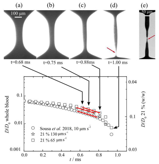 Finally, it should be taken into account in this subsection that human plasma has a slight elastic behaviour caused by a specific protein called fibrinogen [24,79]. It has been demonstrated that, under pure extensional flow, blood plasma has a temperature dependent relaxation time [24]. At around 20, the values reported for plasma have been 126.7 μm/s [24,79] (surrounded by air), and = 42 ± 3 μs (surrounded by air) and = 139 ± 15 μs (surrounded by silicone oil) [81]. Figure 10 shows the filament break in a CaBER recorded by using a high speed camera [24]. Varchanis et al. [79] extend the work done in Ref. [24] to investigate numerically the response of human blood plasma under strong extensional flows in a CaBER, and under constriction complex flows in a contraction–expansion microchannel. In both cases, the numerical results were in good agreement with experimental ones. Therefore, an important issue that should not be ignored in future studies is to have a carrier fluid with viscoelastic properties closer to those of blood plasma.