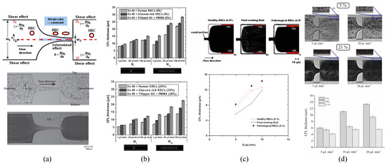 Recently, Pinho et al. [46] have used several types of flexible PDMS microparticles suspended in Dx40. The microparticles were prepared at different mixture ratios of PDMS precursor and curing agent, as shown in Table 2, and generated by using the flow focusing technique described in Section 2; more details are in [44,45]. The results have shown that a thin microparticle-free layer was developed downstream of hyperbolic contraction with = 3.5. A thin layer of the CFL was formed attached to the microchannel walls, and the thickness of this layer tends to increase with the flow rate, as shown in Figure 11c. These results are in good agreement with that of human RBCs (healthy and pathological) suspended in the same carrier fluid, Dx40. More recently, Carneiro et al. [52] have investigated the formation of the CFL in a microchannel with a hyperbolic contraction of = 3.16, using flexible PDMS microparticles produced by a premix membrane emulsification technique. The particle concentrations were 5, 10, and 21 wt%, and Reynolds numbers ranging from 0.08 ≤≤ 2.13. The results have shown that the CFL thickness depends on two parameters: the flow rate and the particle concentration. Accordingly, the CFL thickness increase by either: (i) lowering the PDMS concentration under equal flow rate, or (ii) increasing the flow rate for solutions of equal PDMS concentration, see Figure 11d. These tendencies are in agreemenst with those obtained for quasi-rigid particles [54,55]. RBC particulate fluid [54] showed higher CFL thickness than PDMS particulate fluid [52]. Alternatively, instead of PDMS microparticles, Lima et al. [59] investigated the CFL formation using flexible micelles of 1 wt% Brij L4 at the flow rate of 5 L/min, downstream of a microchannel with an abrupt contraction. The results obtained about the CFL thickness suggest a good agreement between both the proposed blood analogue and in vitro blood.