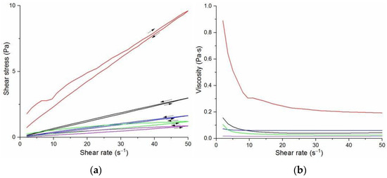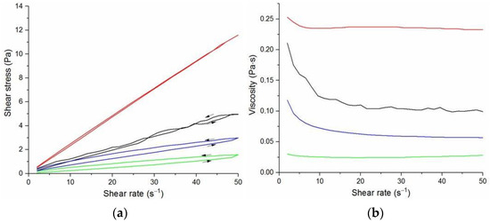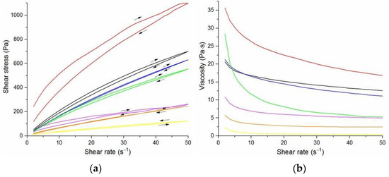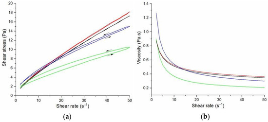 The flow curves and viscosity curves of the cotton liquids are shown in Figure 1, Figure 2, Figure 3, Figure 4 and Figure 5. Most cotton liquids prepared for this study showed non-Newtonian characteristics with a flow limit. The flow limit of all solutions increased during storage. The PU, 80/20 and 50/50 solutions showed less or more visible shear thinning (Figure 1, Figure 2 and Figure 3). The flow curves of the DMF solutions of PU and 80/20 showed no hysteresis, while solutions diluted with DCM and acetone were thixotropic. Rheological behavior of 50/50 and 20/80 depended on the content of a solution. On the other hand, PLDL in DMF formed well-defined Newtonian or Bingham solutions both with acetone and DCM as diluents (see Figure 5).