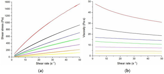 Flow curves (a) and viscosity curves; (b) of solutions of 20/80 PU/PLDL: