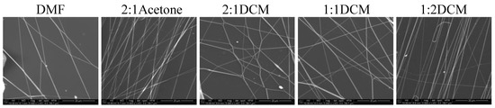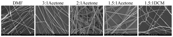 SEM images of electrospun fibers of polyurethane. Needle diameter: DMF, 2:1Acetone, 2:1DCM, 1:1DCM—0.6 mm; 1:2DCM—0.45 mm.