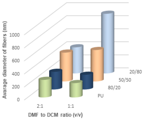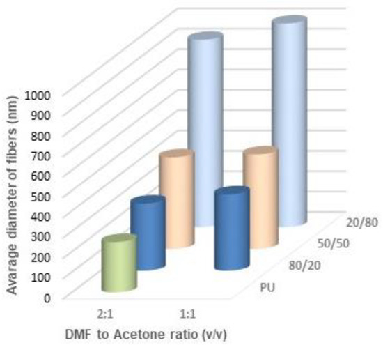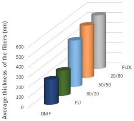 Figure 11, Figure 12 and Figure 13 show the average diameters of the fibers dependent on the polymer ratio and solvents. It is clear that the fibers enriched in PLDL are significantly thicker the other ones when acetone was used as a diluent. The DMF acetone ratio did not influence noticeably the thickness of the fibers (Figure 11). When DCM was applied as a diluent, the fiber diameter depended on the DMF/DCM ratio. Equal amounts of solvents caused similar dependence as DMF/Acetone, i.e., fibers of 20/80 PU/PLDL had the diameter ~900 nm while the rest of polymer compositions gave fibers thinner than 400 nm. The cotton liquids of 2DMF/1DCM behaved similarly to DMF solutions. The fibers were thinner than 400 nm.