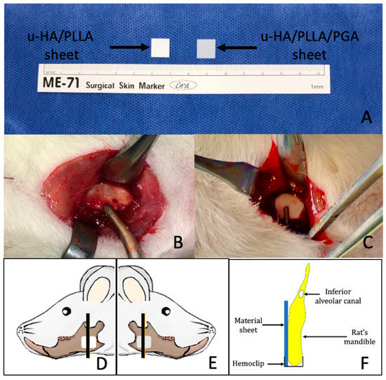 Surgical procedure. (A) u-HA/PLLA sheet (left) and u-HA/PLLA/PGA sheet (right) with the same dimensions: 5 mm length × 5 mm width × 0.3 mm thickness. (B) The mandibular angle area was exposed on the right side. (C) Fixation of the reconstruction material using a hemoclip. The black vertical lines in (D,E) indicate the sites at which samples were collected for analysis. u-HA/PLLA material was applied on the left side and u-HA/PLLA/PGA material on the right side. (F) Schematic coronal view of one specimen.