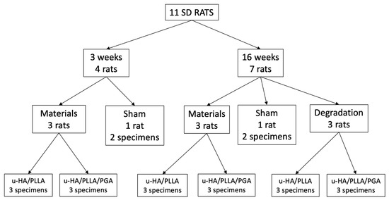 Eleven male Sprague–Dawley rats (age = 10 weeks; weight = 250–270 g) were divided into two groups: material group (n = 9) and sham controls (n = 2). The material group was further divided into two subgroups: u-HA/PLLA/PGA and u-HA/PLLA, in which implantation was performed in the right and left hemi-mandibles, respectively. Hence, each subgroup had nine specimens, of which three were harvested at Week 3 and six at Week 16. At Week 16, the material sheets were detached in three specimens in each subgroup to calculate the degradation rates. In the sham control group, two specimens in one rat were harvested at Week 3, and two specimens in the other rat were harvested at Week 16 (Figure 2).