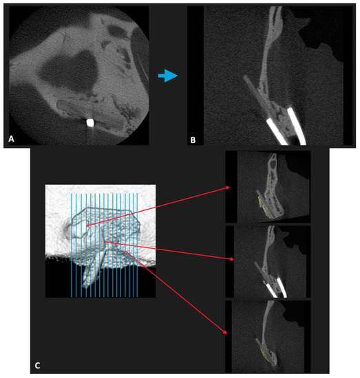 The 3D volumes of the scanned samples were generated from the acquired 2D lateral projections using Fiji software. Before analysis, scanned bone volumes were digitally reoriented using the “Transform: Rotate” plugin in Fiji (http://imagej.net/Fiji, accessed on 9 February 2021) [25]. This ensured that the axes were parallel to the plane of the material sheets (Figure 3B). After rotating the 3D volumes, it was very easy to separate the bony tissue, soft tissue, and both reconstruction material sheets by direct observation, because the level of radiopacity increased in the order of soft tissue, u-HA/PLLA/PGA sheet, u-HA/PLLA sheet, bony tissue, and titanium hemoclip.