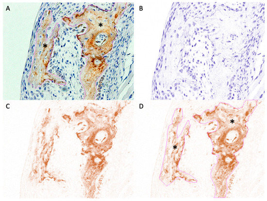 Figure 4. Example of ROI selection for areas containing new bone (anti-OCN IHC staining). (A) Original image with overlay of the selected ROI. *, selected area. (B) Hematoxylin-stained image separated from the original image. (C) DAB-stained image separated from the original image. (D) Superimposition of the saved ROI onto the DAB-stained image. *, selected area. - Fourth, the previously selected ROI was superimposed onto the DAB image (Figure 4D).