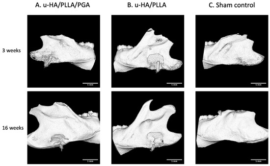 Micro-CT images of rat hemi-mandibles. The u-HA/PLLA/PGA is not visible due to the low proportion of u-HA. 3D view of the (A) u-HA/PLLA/PGA subgroup, (B) u-HA/PLLA subgroup, and (C) sham control group. Scale bar: 5 mm.