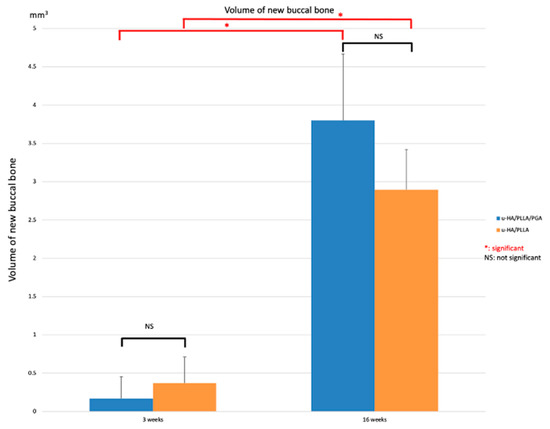 The volume of new bone on the outer side of the material sheet in both groups was very low at Week 3 (0.372 and 0.168 mm3, respectively) and very high at Week 16 (2.895 and 3.801 mm3, respectively). According to the volume of outer bone, there were no significant differences in new bone formation between the u-HA/PLLA and u-HA/PLLA/PGA subgroups at each time point (p > 0.05). However, the mean volume of newly formed bone differed considerably between the two time points in each material group (p < 0.05) (Figure 6).