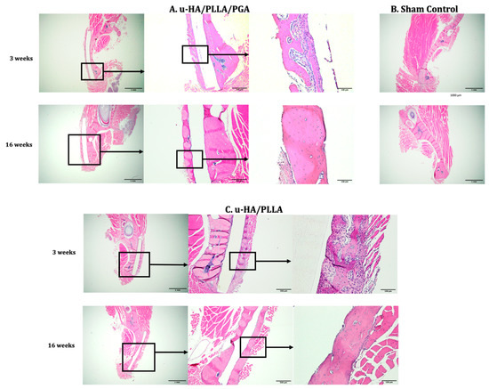 Hematoxylin-and-eosin-stained sections from the u-HA/PLLA/PGA subgroup, u-HA/PLLA subgroup, and sham control. Images of each subgroup were taken at 1.25×, 4×, and 20× magnification (from left to right). Images of the sham control group were taken at 1.25× magnification. (A) u-HA/PLLA/PGA subgroup. (B) Sham control group. (C) u-HA/PLLA subgroup. Scale bar: 1 mm (1.25× magnification), 500 μm (4× magnification), and 100 μm (20× magnification).