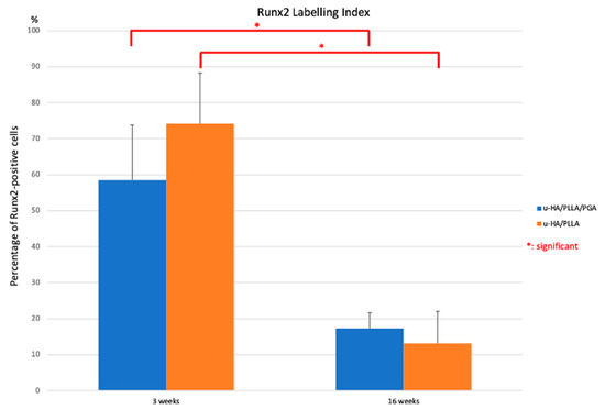 Runx2 labeling index in the u-HA/PLLA/PGA and u-HA/PLLA subgroups. * p < 0.05.